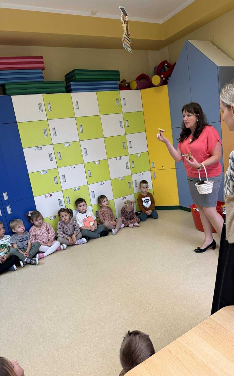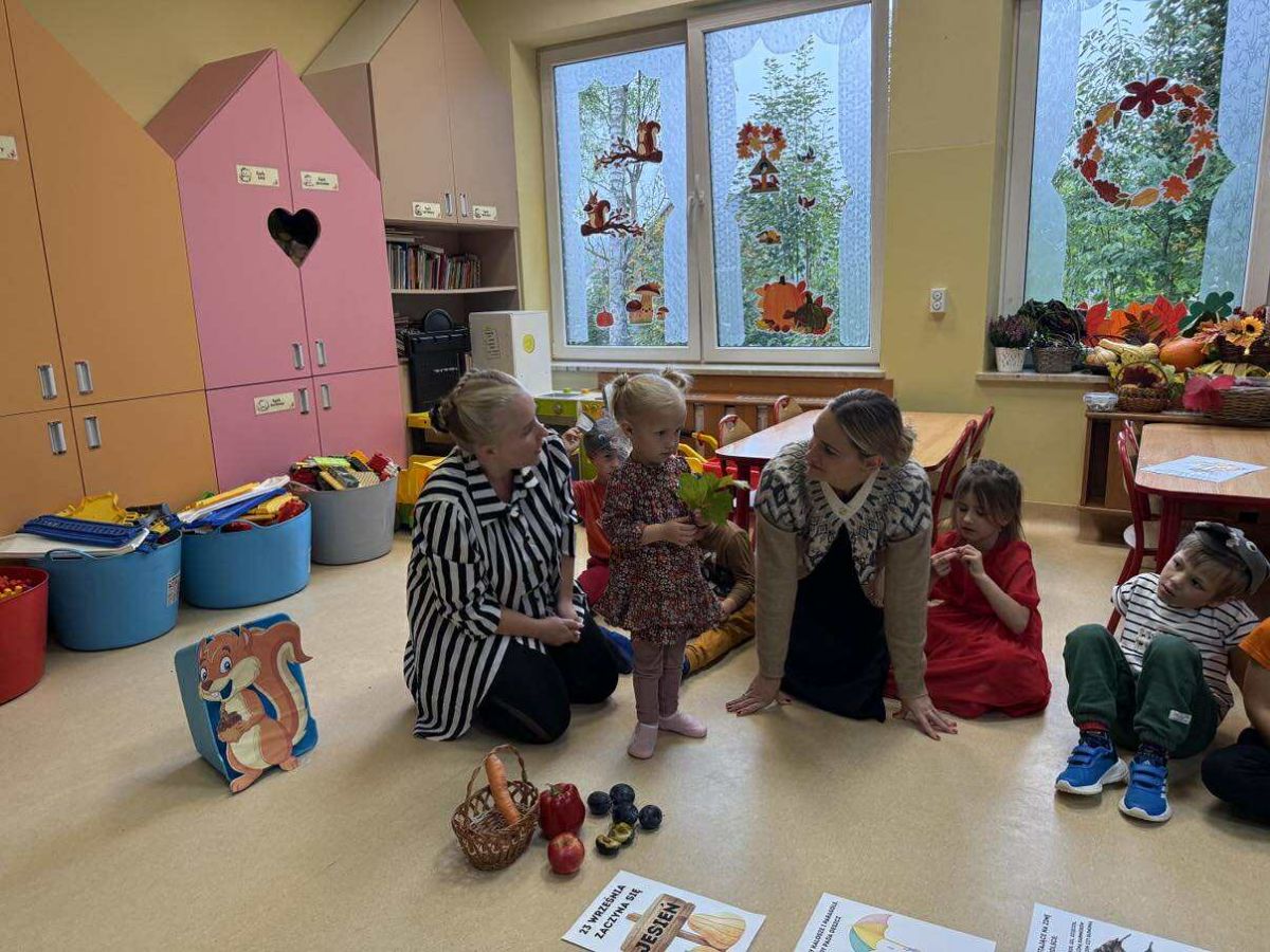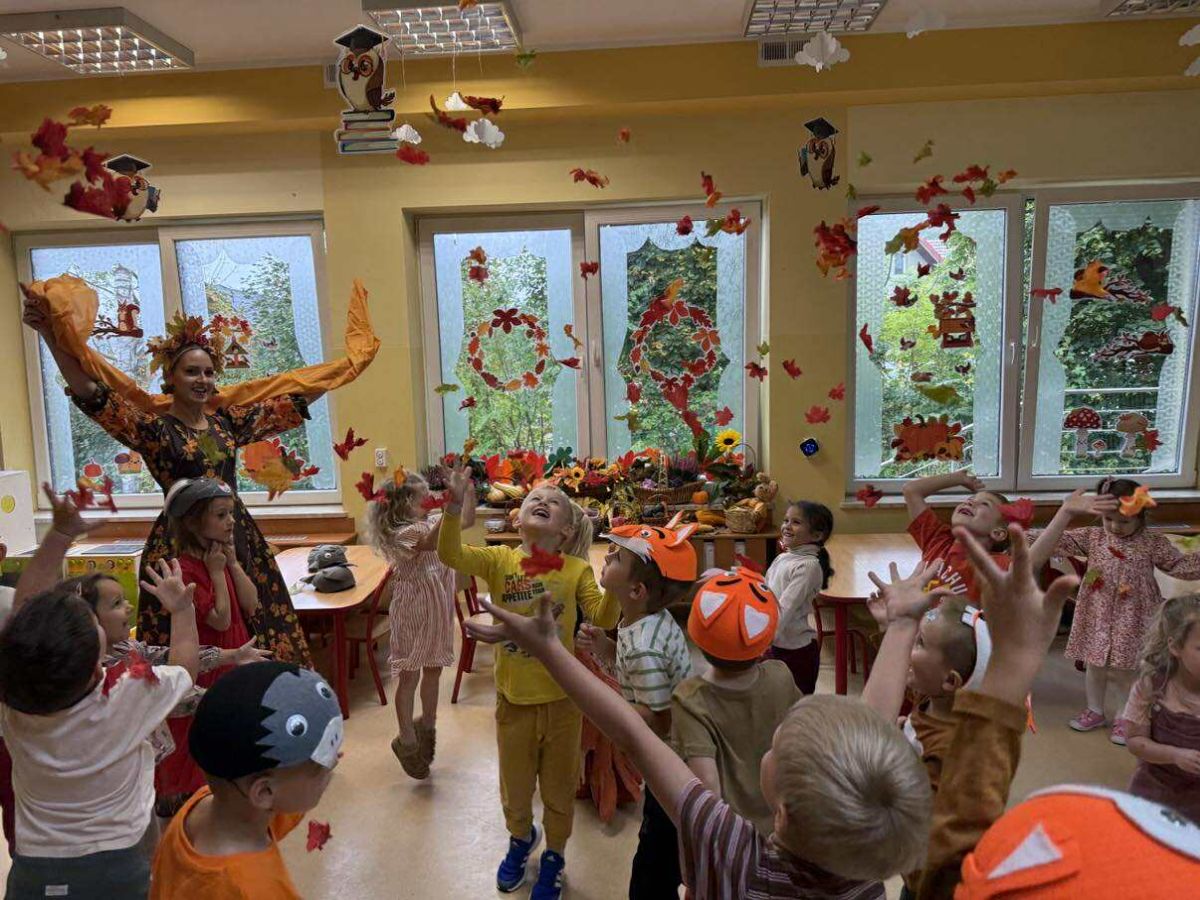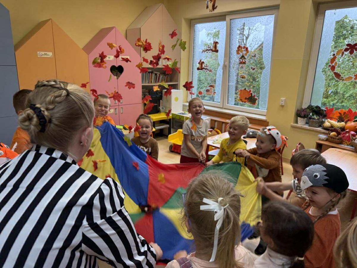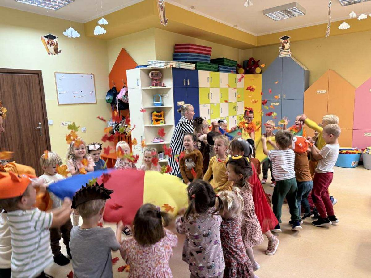 Do naszego przedszkola zawitał niezwykły gość – Pani Jesień! Ubrana w kolorowe liście, z koszykiem pełnym jesiennych skarbów, opowiadała dzieciom o zmianach w przyrodzie, spadających liściach i darach, jakie przynosi ta piękna pora roku.