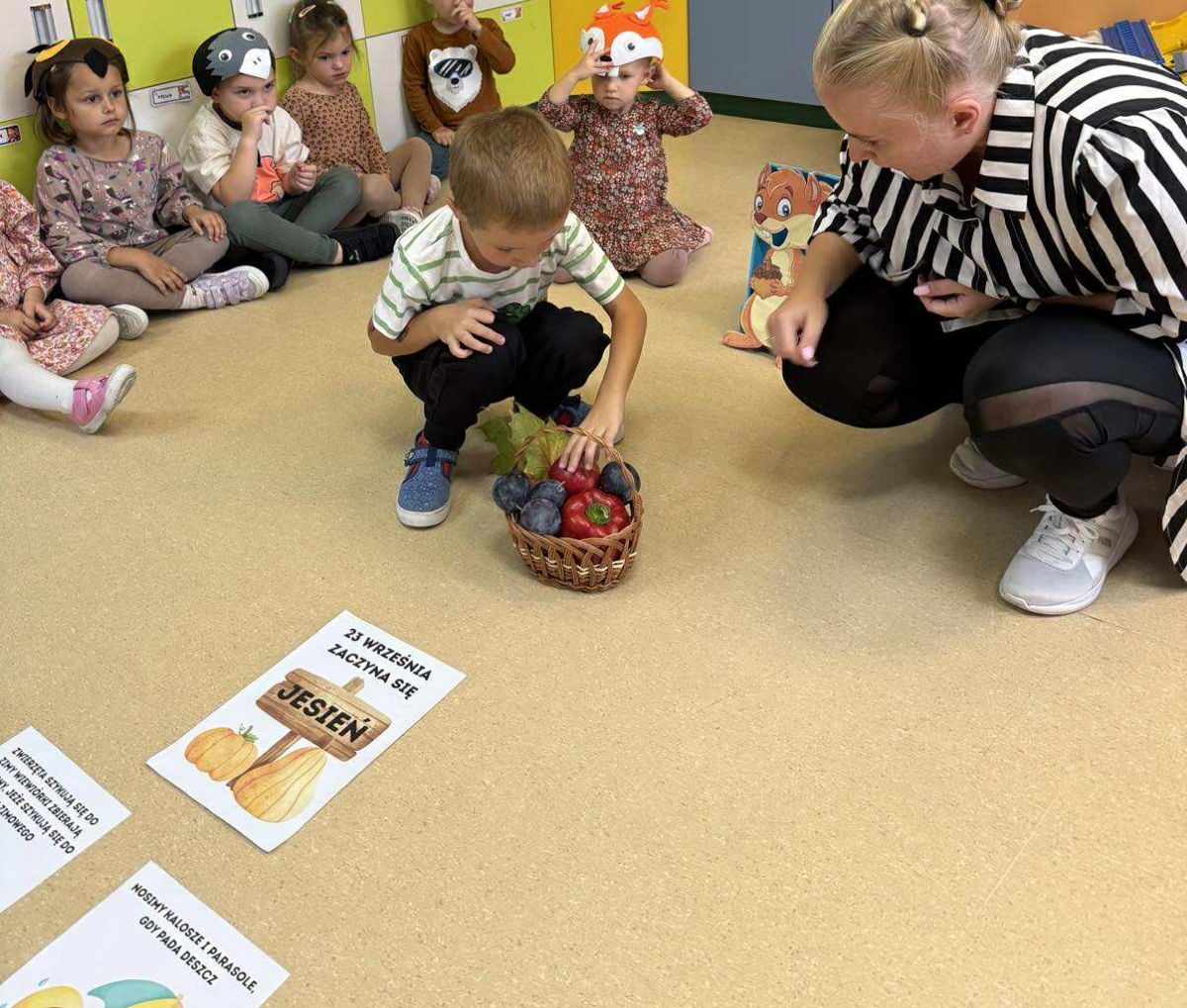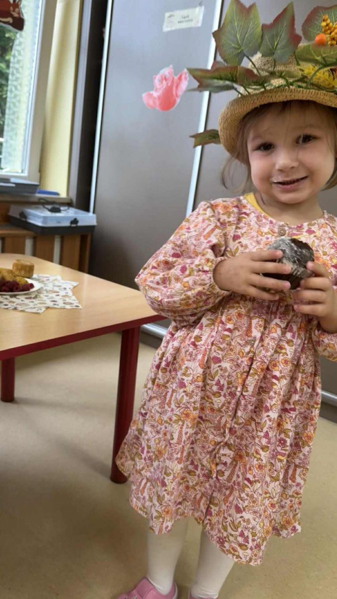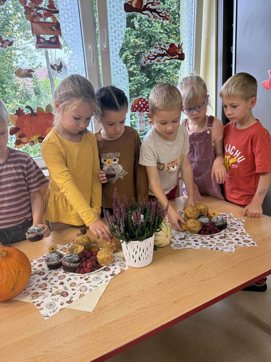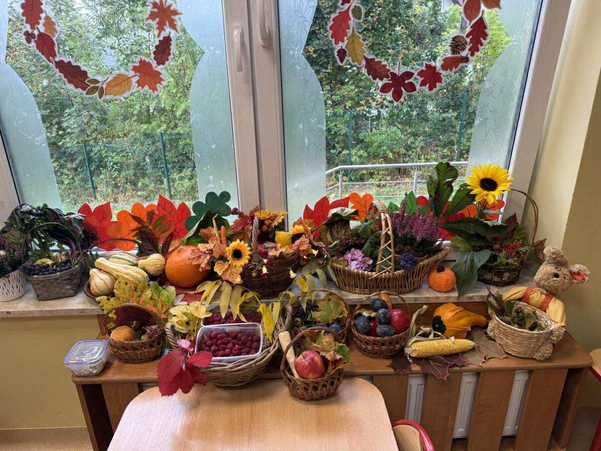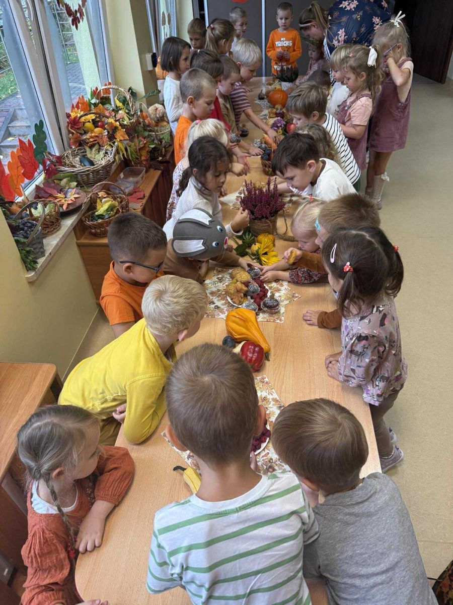 Nie zabrakło wesołych zabaw, skocznych tańców przy muzyce, zagadek oraz obserwacji. Na koniec czekała na wszystkich pyszna niespodzianka – poczęstunek z jesiennych smakołyków: jabłek, gruszek, orzechów, dyni i innych pyszności. Było kolorowo, wesoło i bardzo smacznie!